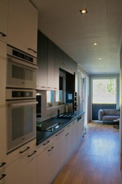 Küche mit Backofen, Mikrowelle, 5 Zonen Kochfeld, große Kühl- und Gefrierkombi, Wasserkocher, Toaster, Filterkaffeemaschine, Handrührgerät, Küchenwaage und vieles mehr