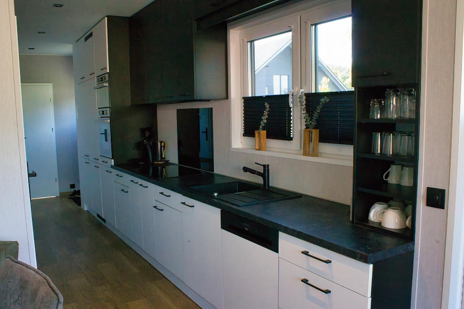 Küche mit Backofen, Mikrowelle, 5 Zonen Kochfeld, große Kühl- und Gefrierkombi, Wasserkocher, Toaster, Filterkaffeemaschine, Handrührgerät, Küchenwaage und vieles mehr